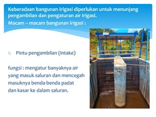 bangunan air - SlideShare Keberadaan bangunan irigasi diperlukan untuk menunjang pengambilan dan pengaturan air irigasi. Macam - macam bangunan irigasi : 1. Pintu pengambilan (intake) fungsi : mengatur banyaknya air yang masuk saluran dan mencegah masuknya benda-benda padat dan kasar ke dalam saluran. 3. 1. Saluran irigasi Primer terdiri dari : bangunan utama, saluran ...