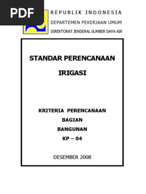 PDF Standar Perencanaan Irigasi Sistem Irigasi merupakan upaya yang dilakukan oleh manusia untuk memperoleh air dengan menggunakan bangunan dan saluran buatan untuk mengairi lahan pertaniannya. Upaya ini meliputi prasarana irigasi, air irigasi, manajemen irigasi, kelembagaan pengelolaan irigasi dan sumber daya manusia. Terkait prasarana irigasi,