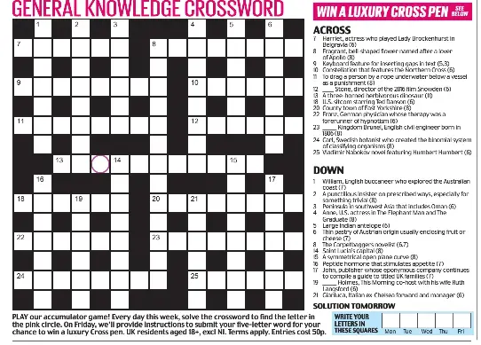 Best for Puzzles guide to general knowledge crossword puzzle sites A new Chambers Online General Knowledge Crossword is posted around the middle of each month. A faily easy general knowledge crossword. You can do today's Quizword in two ways. Either fill in the grid online or print it out and fill it in with a pen.